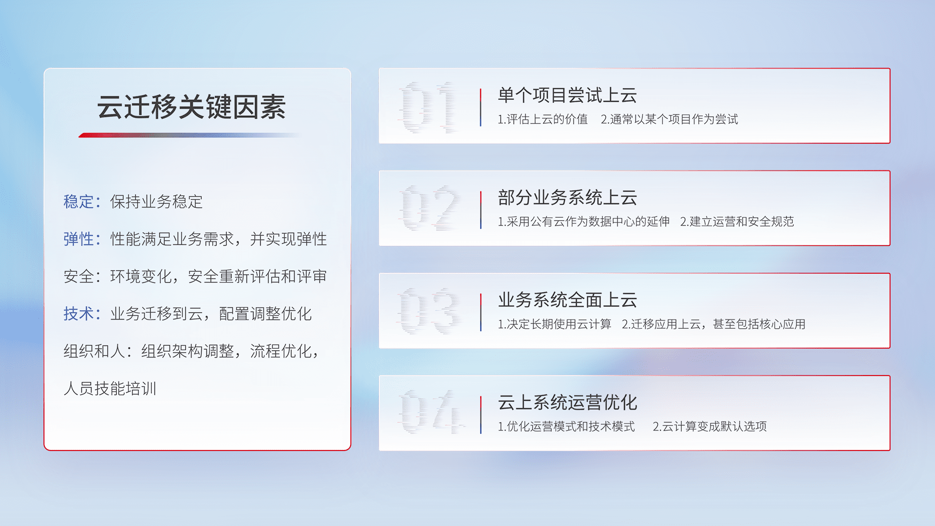 结合实际业务,,,,从规划设计、、、云平台选型、、、云原生改造、、、数据迁移、、、、集成交付,,,迁移全过程为客户识别最佳上云路径,,做好风险识别管理,,,,设计网络架构、、身份权限、、、、安全审计合规、、、操作审计、、、、日志审计、、监控告警策略、、、、多站点容灾设计等,,对云上基础设施进行整体规划,,,,提升IT治理水平,,,,以满足弹性、、、高可用、、、高性能的需求。。。。